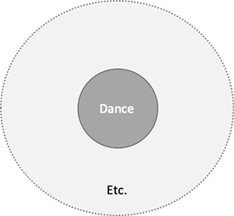 국내에서도 ‘춤추지 않는 무용 공연’, ‘말하는 공연’들이 많이 소개되고 있죠. 말과 함께 춤인지 아닌지 알 수 없는 행위들을 보여주기는 하지만 우리가 잘 알고 있는 테크닉 위주의 댄시 댄스(Dancey Dance)보다 무용수의 퍼포머티브(Performative)가 강조됩니다. 하지만 무대 위에서 말을 하느냐, 그렇지 않느냐는 중요한 것은 아니에요. 좀 더 맥락적이고 구조적으로 접근해보면 좋을 것 같아요. 여기 그림을 보시면 농당스 계열의 춤과 우리가 생각하는 기존의 춤에 대한 관계를 알 수 있어요. 농당스에서도 여전히 춤이 핵심에 있고 그 주변, 그러니까 춤과 춤 이외의 것들을 모두 포섭하는 방식이거나 춤의 주변을 우회하면서 춤에 대해 접근하는 방식이라고 볼 수 있어요. 농당스 계열의 안무가들이 춤을 추지 않으면서 본인들을 안무가로 규정하는 것은 결국 작업에서 춤에 대한 질문으로 향하고 있기 때문이죠.