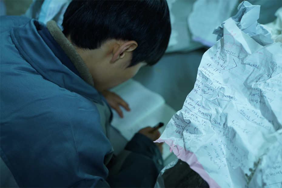 이를 테면, 옥상에서 내려와 매점으로 향하다보면 철문에 QR 코드가 붙어있고 메세지를 따라 문을 열고 들어가면 ‘반’의 추억의 장소인 매점 앞에 종이 더미에 둘러쌓인 채 끊임없이 무언가를 적고 있는 남자가 앉아있는 식이다. 매점은 공연의 여부와 상관없이 실제로 운영되고 있는 매점이지만, 앉아서 글을 적고 있는 남자는 극적 연출의 일부다. 이렇게 실제 공간과 극이 혼재되고, 더불어 계속해서 ‘반’이 보내오는 메세지들이 관객이 극을 따라 발걸음을 옮기도록 끊임없이 호기심을 자극한다.
