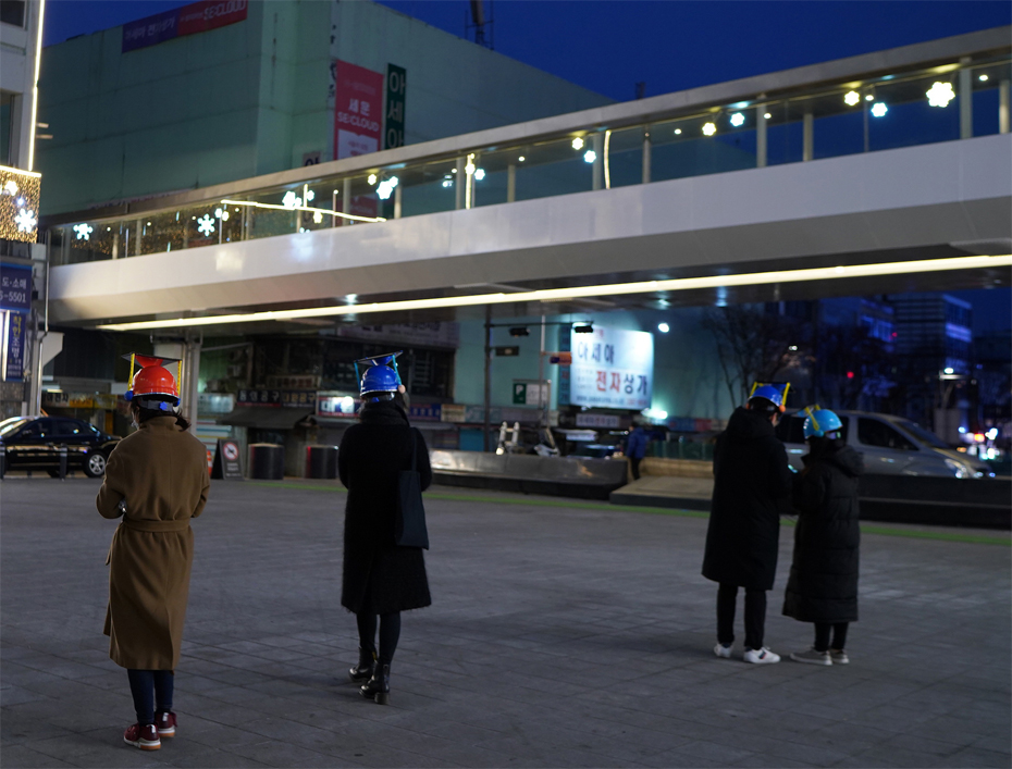 공연은 스피커와 거울이 달린 헬멧을 쓰는 것으로 시작된다. 얼마 전 서울시의 도시재생사업을 통해 리모델링 된 세운상가 꼭대기 층 ‘서울옥상’에서 헬멧을 나누어받고, 관객이 각자의 스마트폰을 켜서 거울이 붙어있는 헬멧과 연결하면 거기서부터 이야기가 진행된다. 헬멧은 시야를 가려 관객이 때때로 현실과 차단되어 스토리 안으로 몰입할 수 있게 하는 역할을 하고, 동시에 헬멧 뒤에 달린 스피커가 일정 장소에 도착하면 음악을 재생하여 공간의 분위기를 더욱 배가시켜 주었다. 특히 앱은 이 공연의 필수요소로, 관객은 예약 시 제출하였던 이메일 주소로 스마트폰 앱의 다운로드 링크를 사전에 받게 된다. 공연을 관람하기 위한 일종의 숙제인 셈인데, 메일에 적혀있는 안내를 따라 앱을 관객 본인의 스마트폰에 설치해야만 공연을 관람할 수 있다는 안내가 사전에 공지되기도 했다.